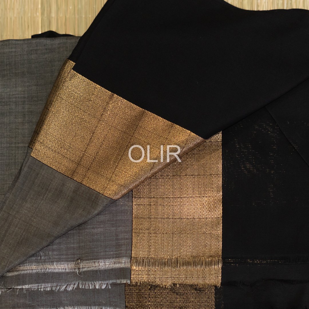 This charcoal grey silk blend saree with multicolor pallu is crafted in premium Maheshwari Silk Cotton,