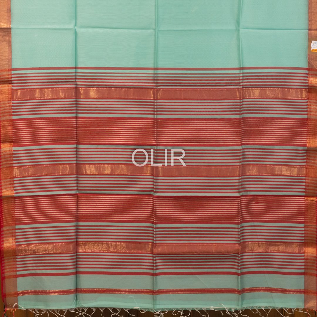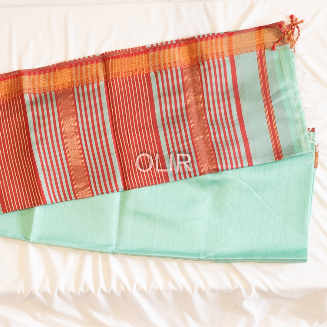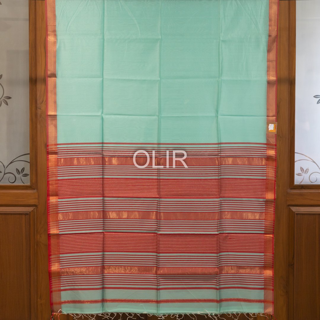 This cyan zari border saree with red pallu is crafted in premium Maheshwari Silk Cotton,