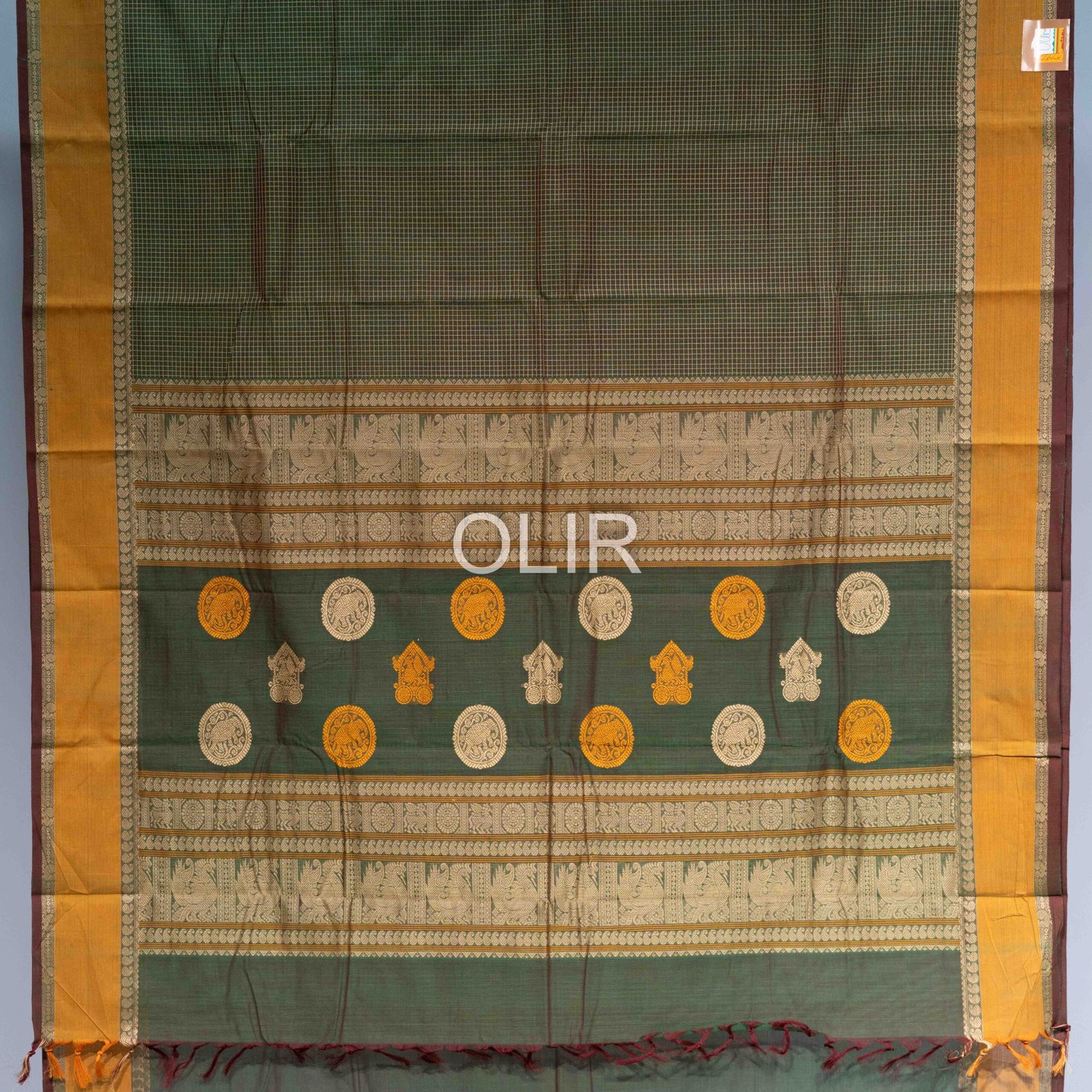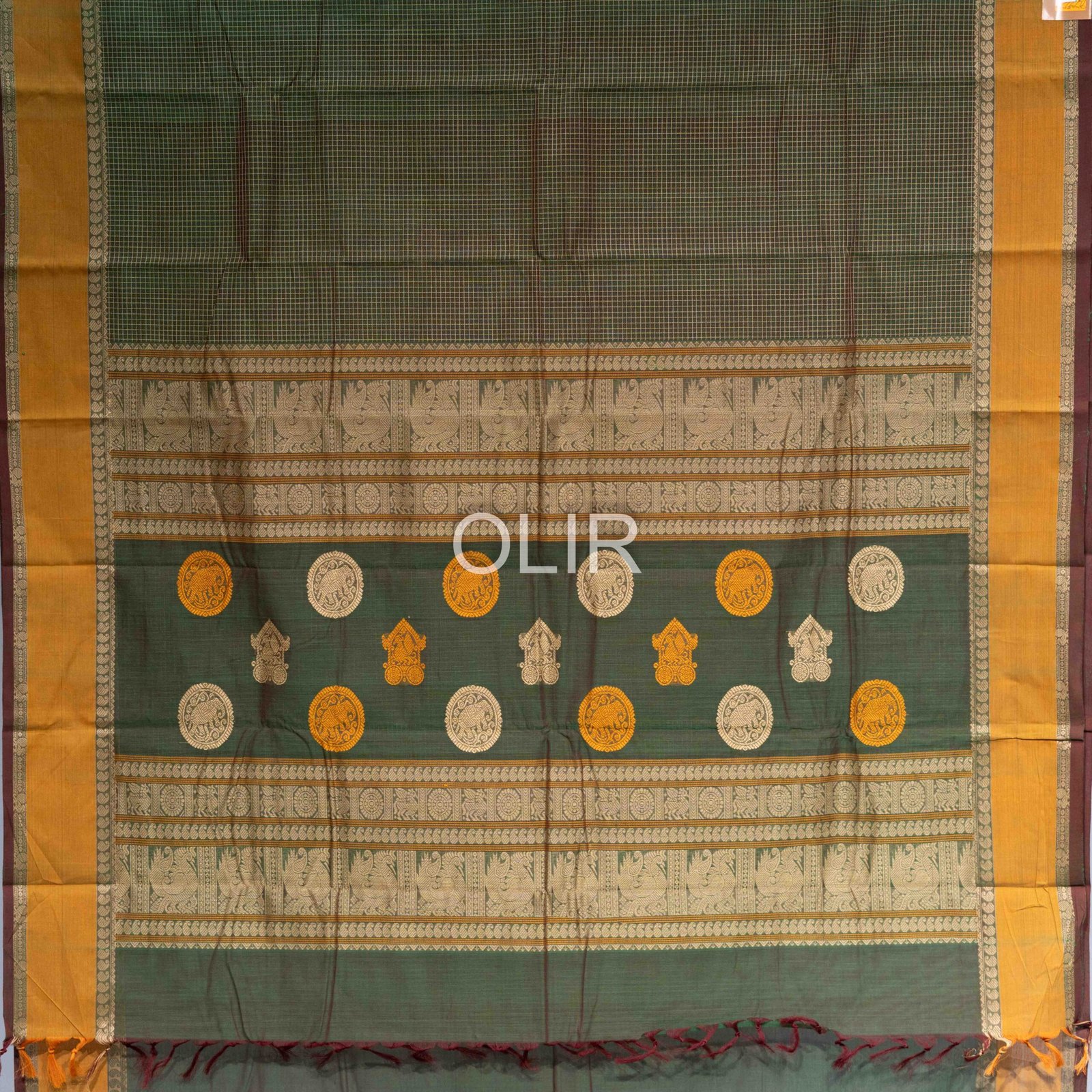 Dark green with tiny checks all over the body. Thread woven double border with Mango and peacock motifs on either sides, with Mustard yellow in between. Pallu is elaborate with multiple thread woven motifs like, peacock, elepaht, swan etc.