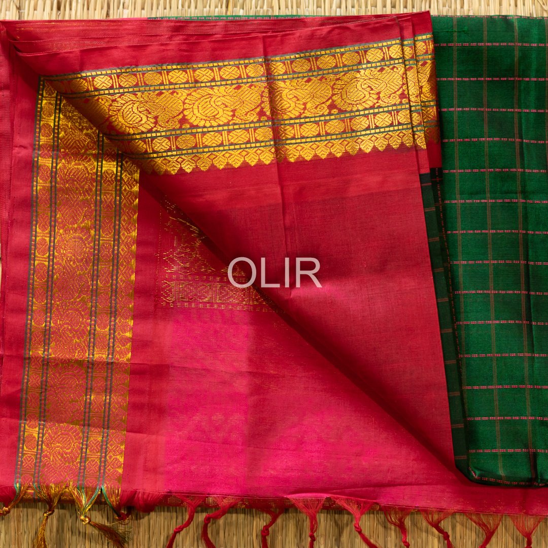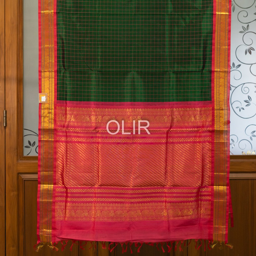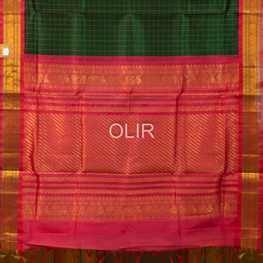 Dark green with pink big checks with bright pink gold zari border with peacock and rudraksh motifs. Pallu is grand in bright pink with traditional motifs