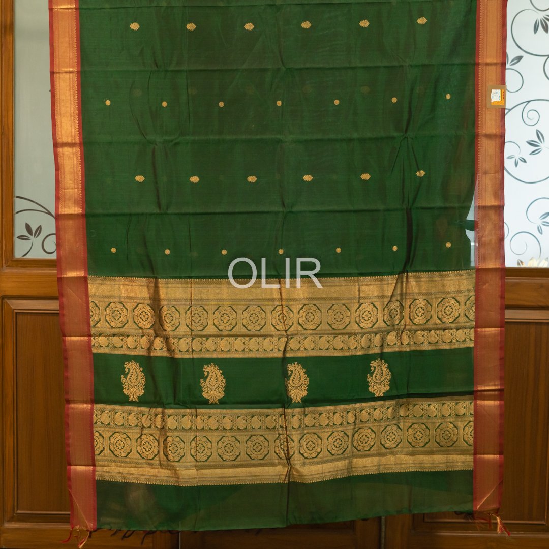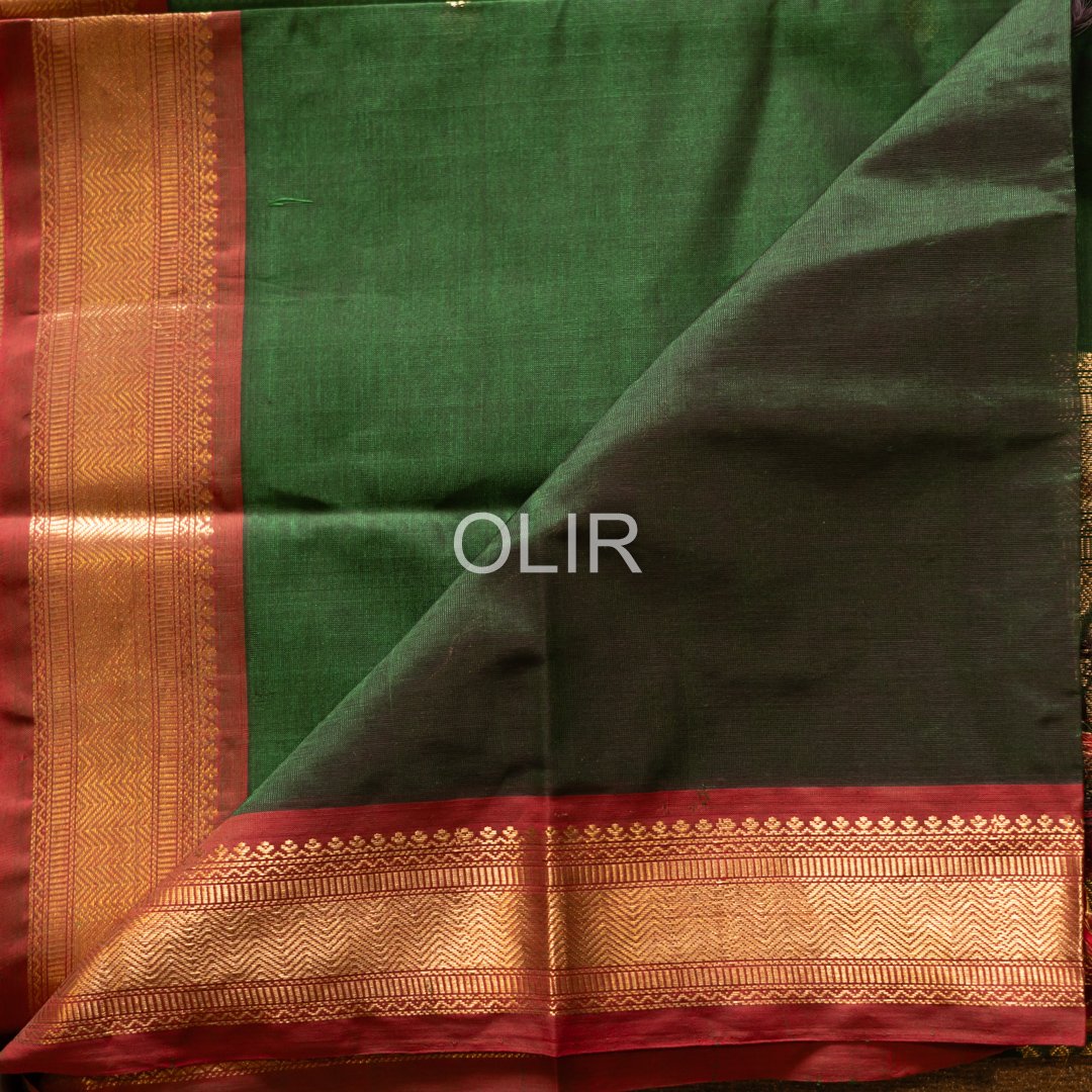 Dark green body with zari buttis and red gold zari kinar border with red selvedge. Pallu is grand with gold zari weaving with floral and Mango motifs.