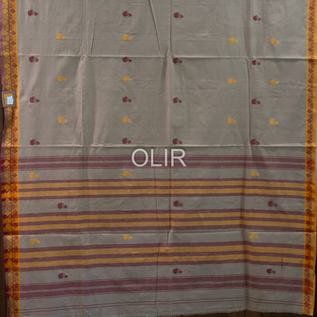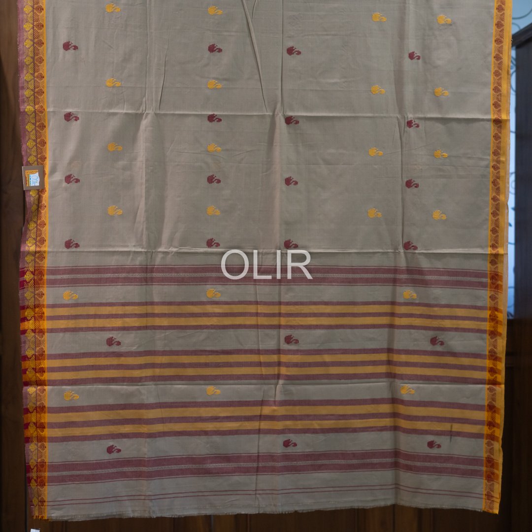 Simple yet elegant, this Beige Dhonekali Cotton Saree features delicate woven buti motifs across the body, complemented by a mustard and maroon striped pallu. Known for its lightweight texture and airy feel, this saree is perfect for everyday wear, office use, and warm weather comfort, reflecting the timeless charm of West Bengal handloom.