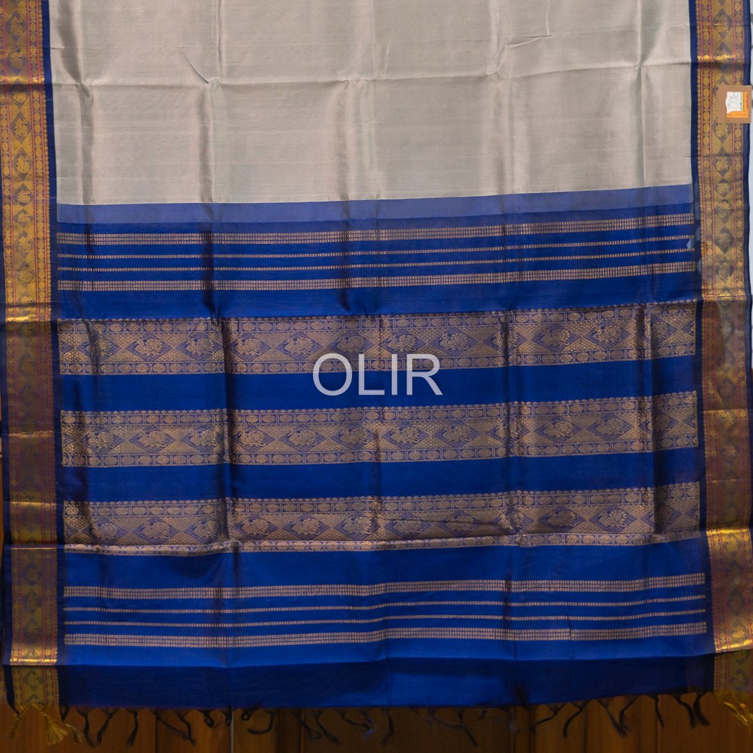 Grey plain body with Dark blue gold zari border with Peacock and Rudraksh motifs. Pallu is zari woven with Rudraksh and Peacock motifs.