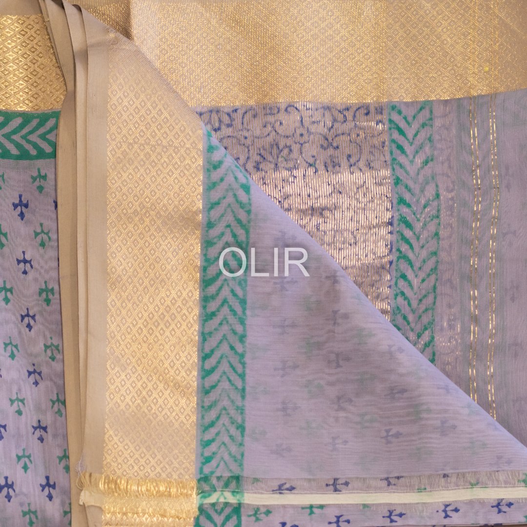 This lavender handblock print saree with tissue pallu is crafted in premium Maheshwari Silk Cotton,
