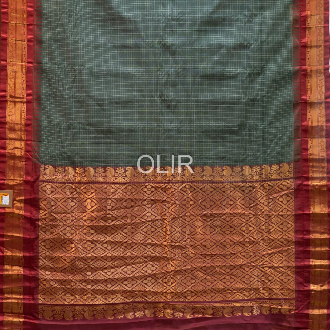 Military Green with Maroon Border Handwoven Gadwal Cotton Saree with Semi Silk Zari Border and Pallu in Kuttu Weaving