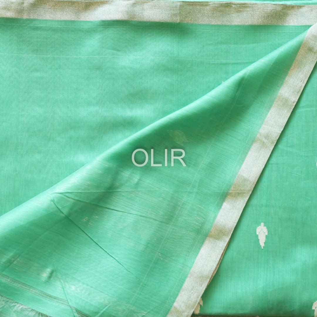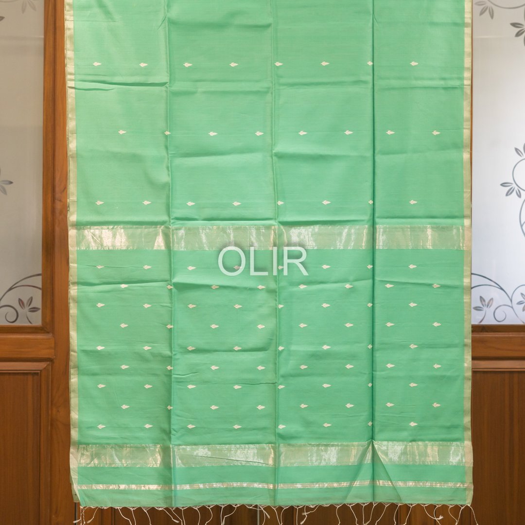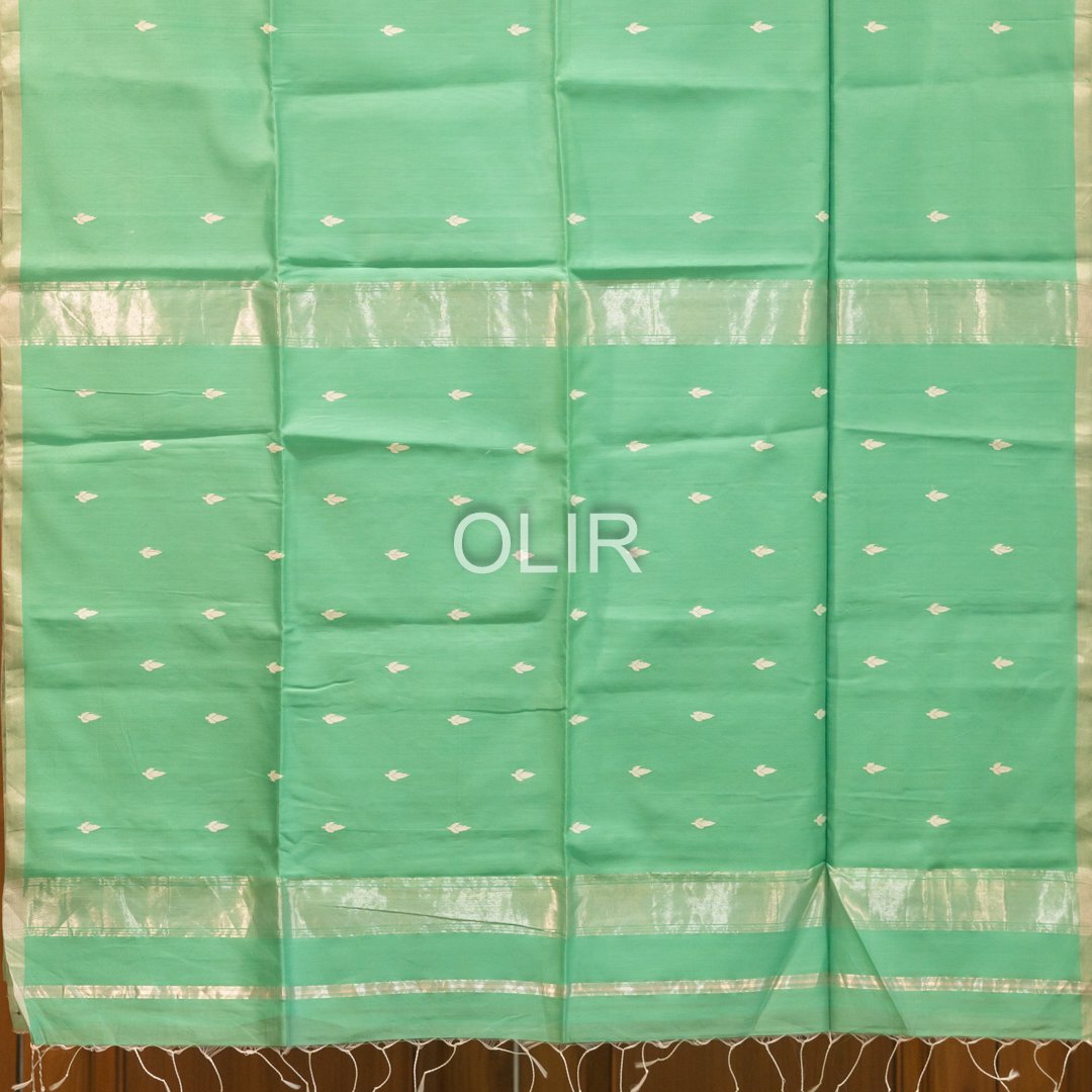 This mint green butti saree with silver tissue pallu is crafted in premium Maheshwari Silk Cotton,