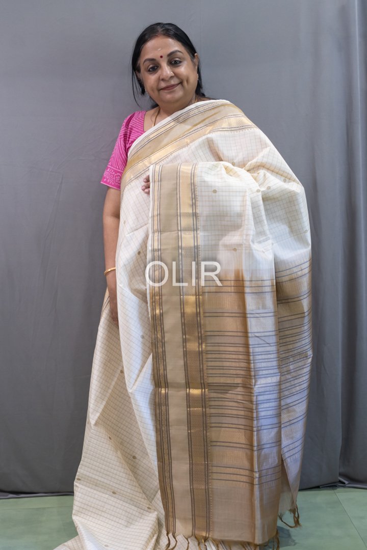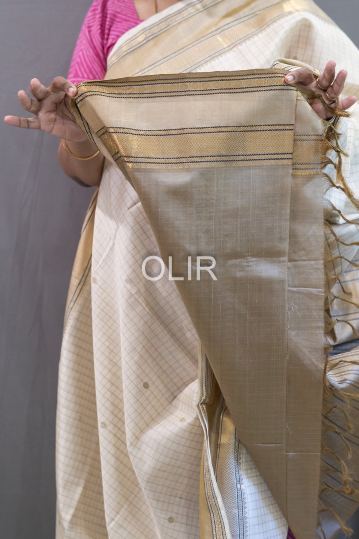 Off-white saree with delicate checks and round buttis, finished with a beautifully contrasting border. The soft silk cotton fabric ensures comfort while maintaining a rich traditional look.