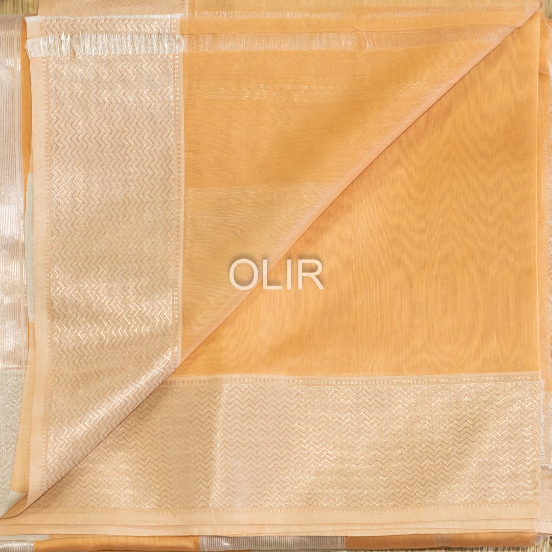 This peach meenakari maheshwari saree with silver tissue pallu is crafted in premium Maheshwari Silk Cotton,