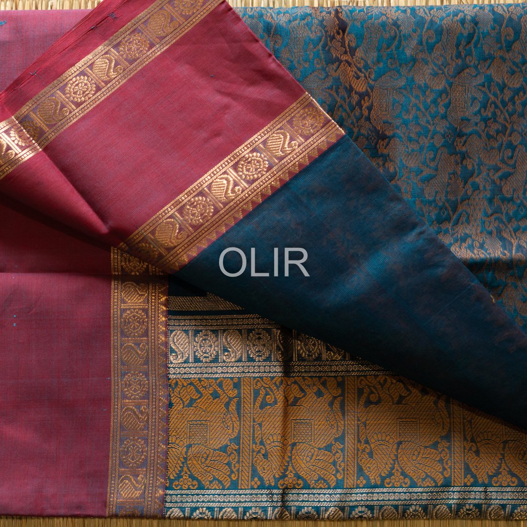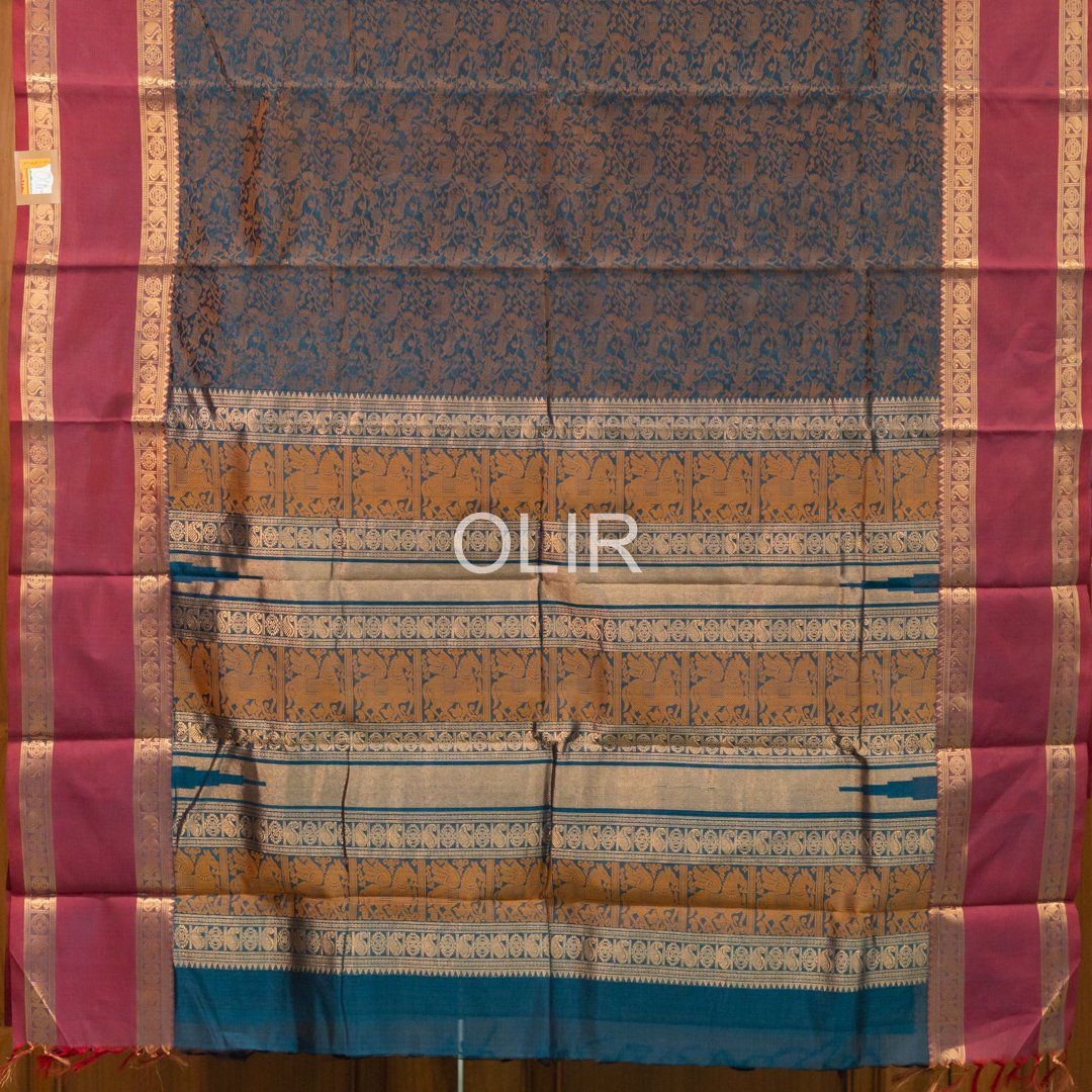 Peacock Green Vanasingaram saree with Gold zari double boder with red border and selvedge. Pallu is grand with elaborate zari work with intricate weavings of horse yali, peacock and rudraksh motifs.