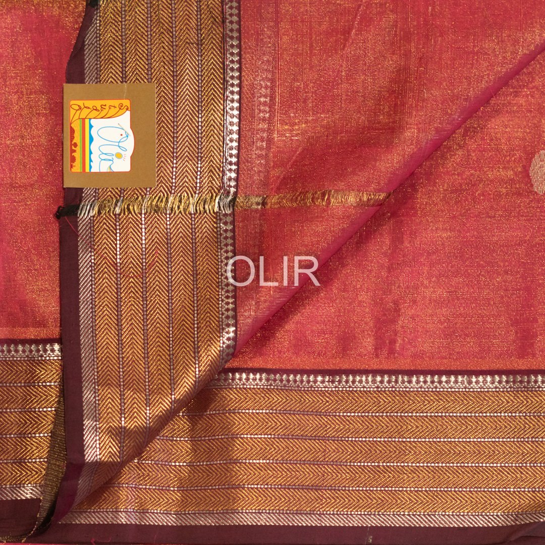 This rose pink tissue saree with zari border is crafted in premium Maheshwari Silk Cotton,
