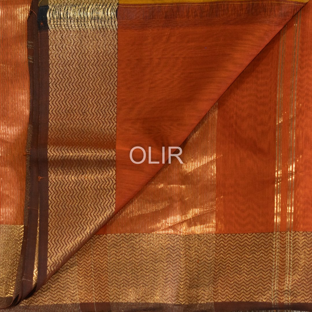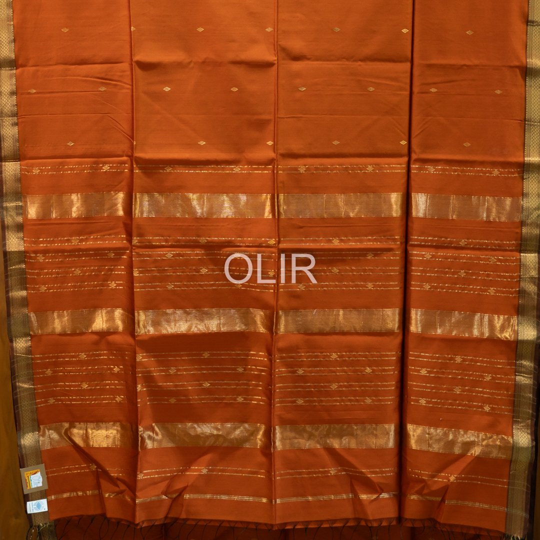 This rust orange diamond butti saree is crafted in premium Maheshwari Silk Cotton,