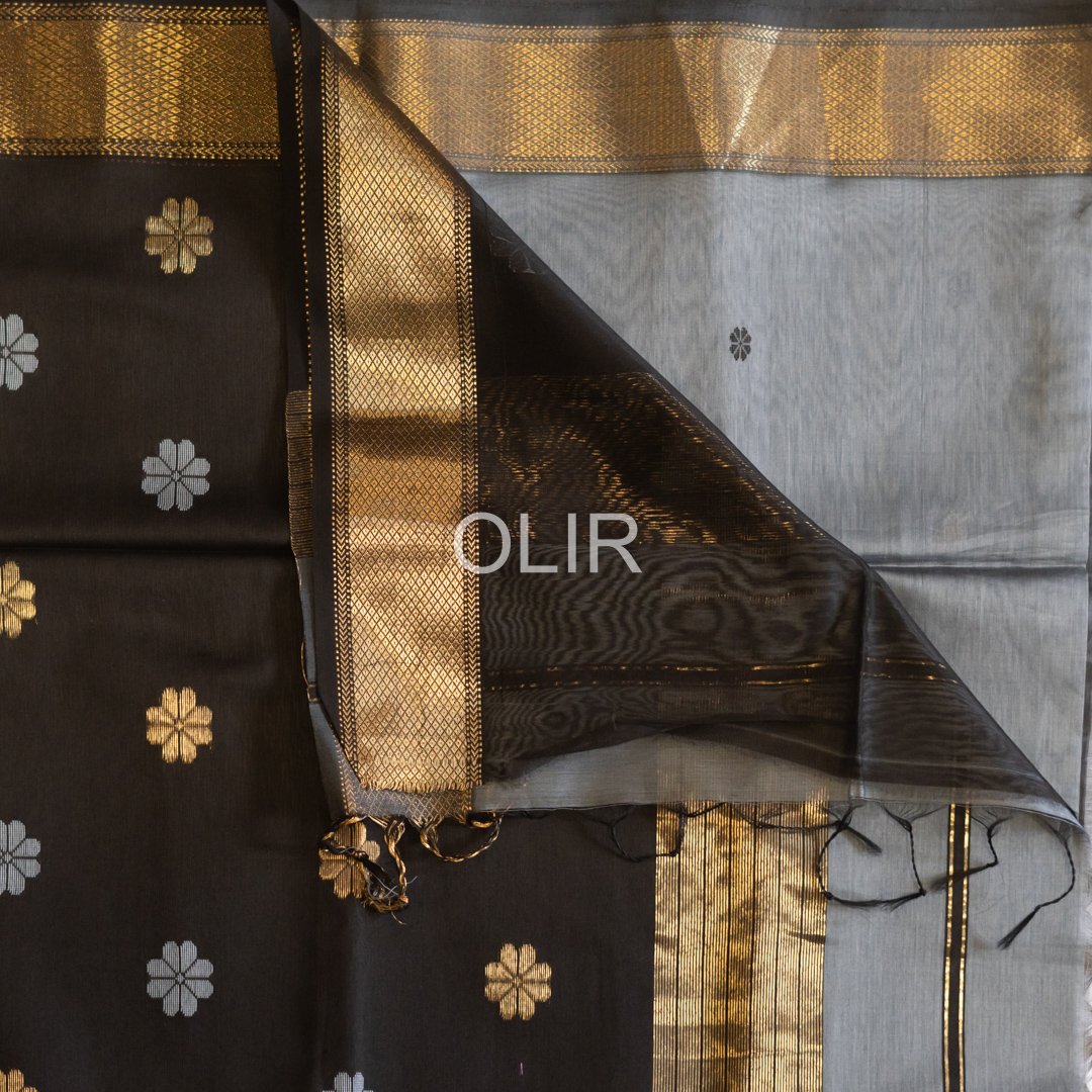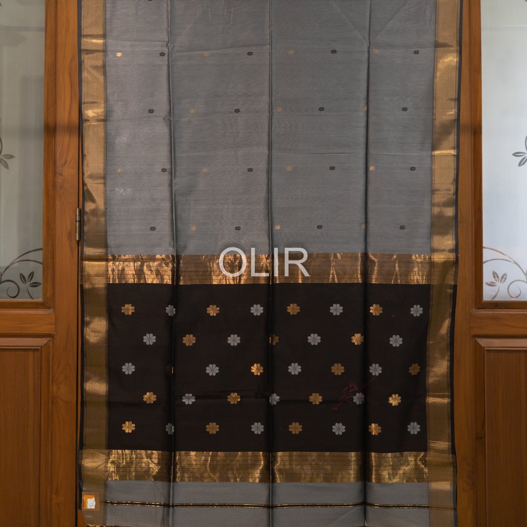 This slate grey floral butti saree with black pallu is crafted in premium Maheshwari Silk Cotton,