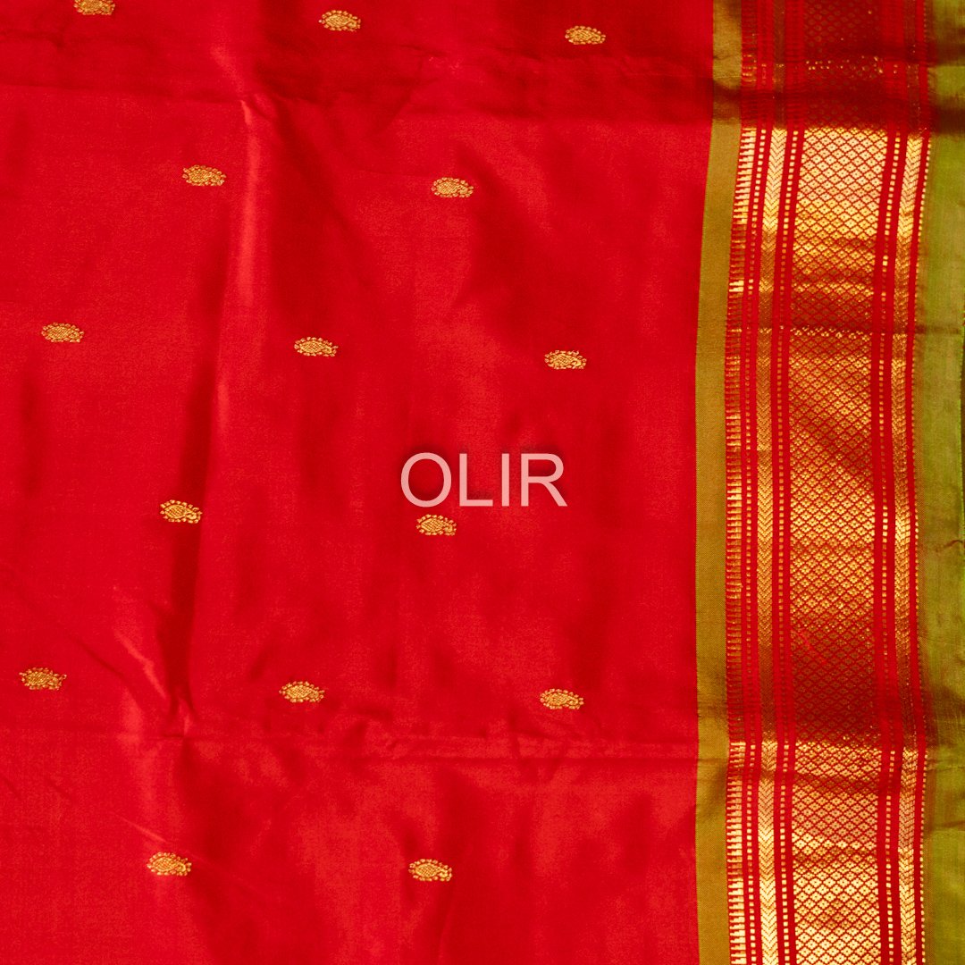 This is a Traditional Red Pure Silk Paithani Saree with Mehendi Green Zari Woven Border with a green Selvedge. The border and the Pallu are woven with intricate gold zari work. The pallu features traditional Peacock motifs.