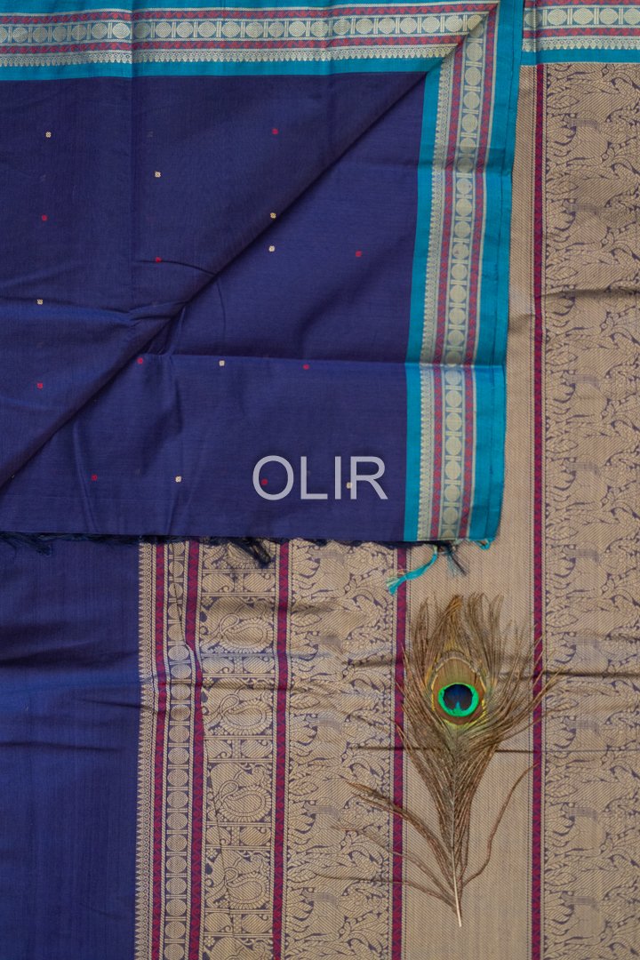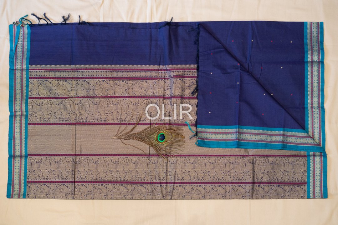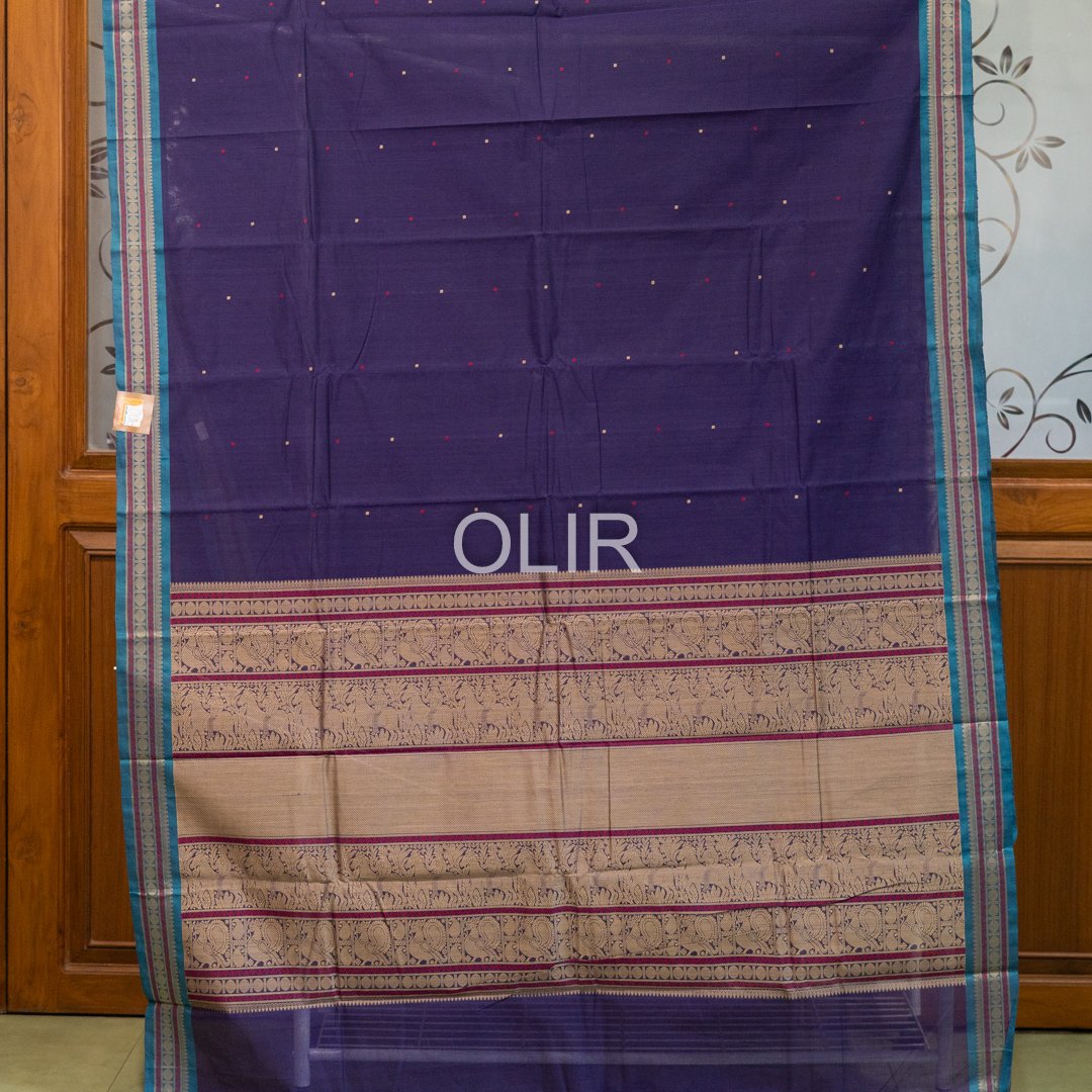 Violet with Ananda Blue Rudraksha Border . The sarees has tiny thread flower buttis