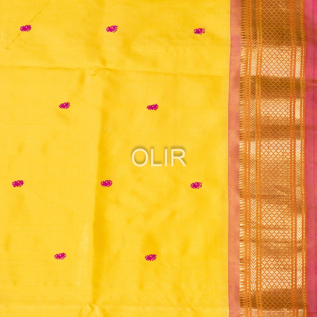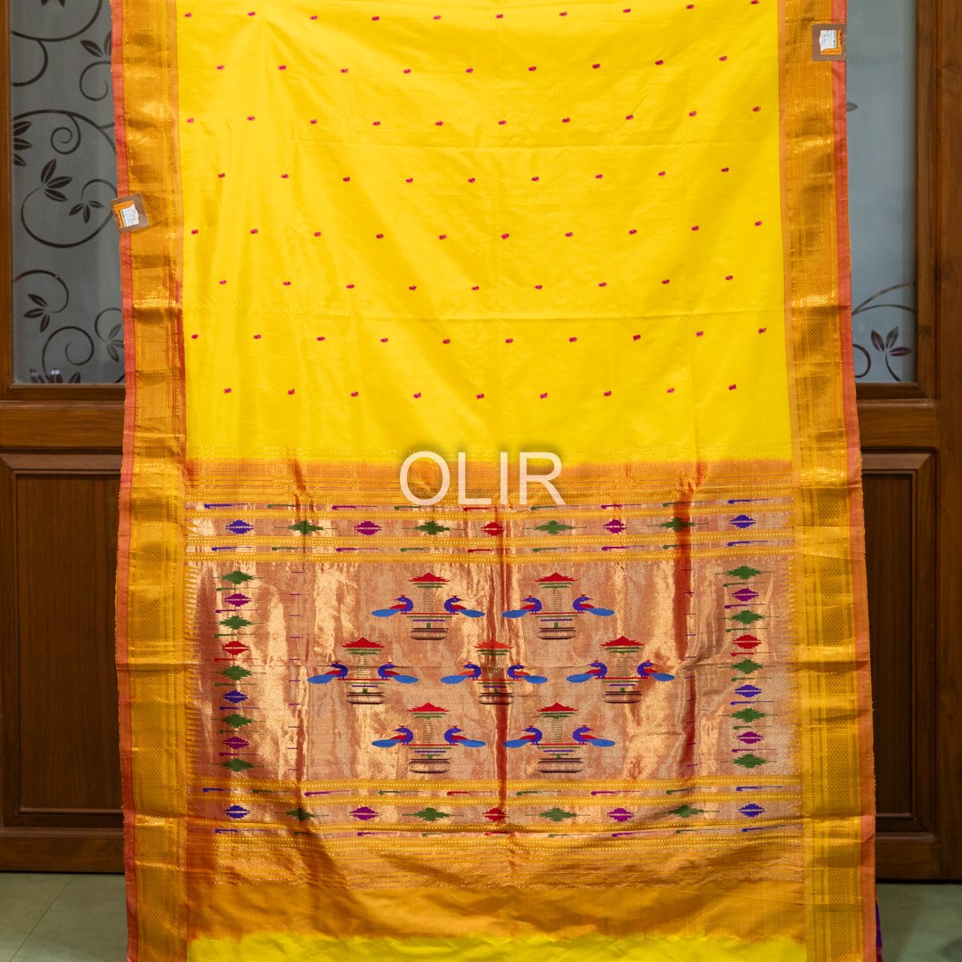 This is a Yellow Pure Silk Paithani Saree with Peachy Orange Zari Woven Border with a Orange Selvedge. The border and the Pallu are woven with intricate gold zari work. The pallu features traditional Peacock motifs.