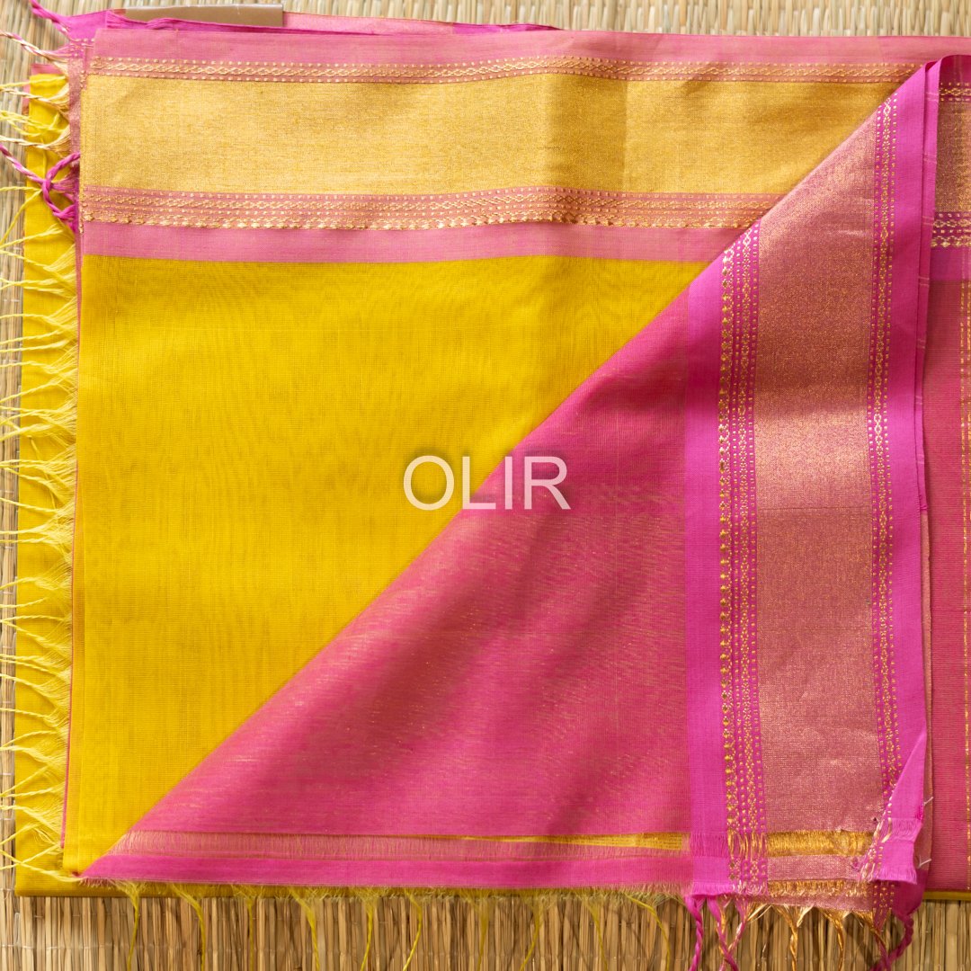 This yellow pink tissue border saree is crafted in premium Maheshwari Silk Cotton,